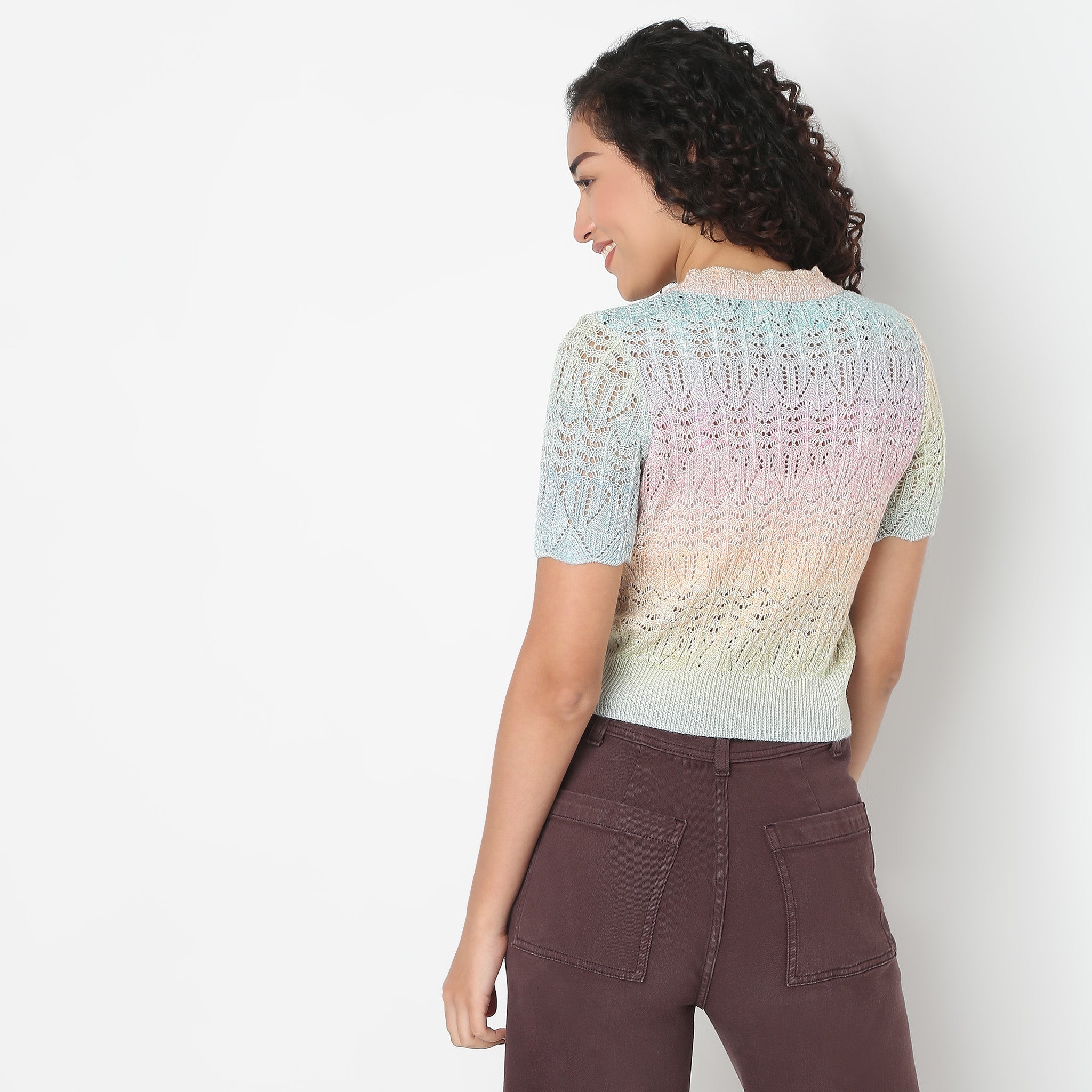 Experience the perfect blend of style and comfort with the Betty Regular Fit Fashion Tee. Crafted from a luxurious blend of acrylic and polyester, this tee promises a soft touch against your skin while ensuring durability and easy maintenance. The solid pattern and cropped length make it a versatile piece that can effortlessly transition from casual daywear to a chic evening look. The round neck and short sleeves offer a classic silhouette that flatters all body types.