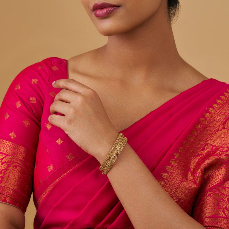 Traditional Design Antique BangleEmbrace the main character's energy with these antique bangles. Set in a rich gold tone polish, these bangles are the epitome of simplicity and festiveness in harmony. Pair with an anarkali for a Bollywood movie kind of look, or pair with evergreen sarees for a traditional look.