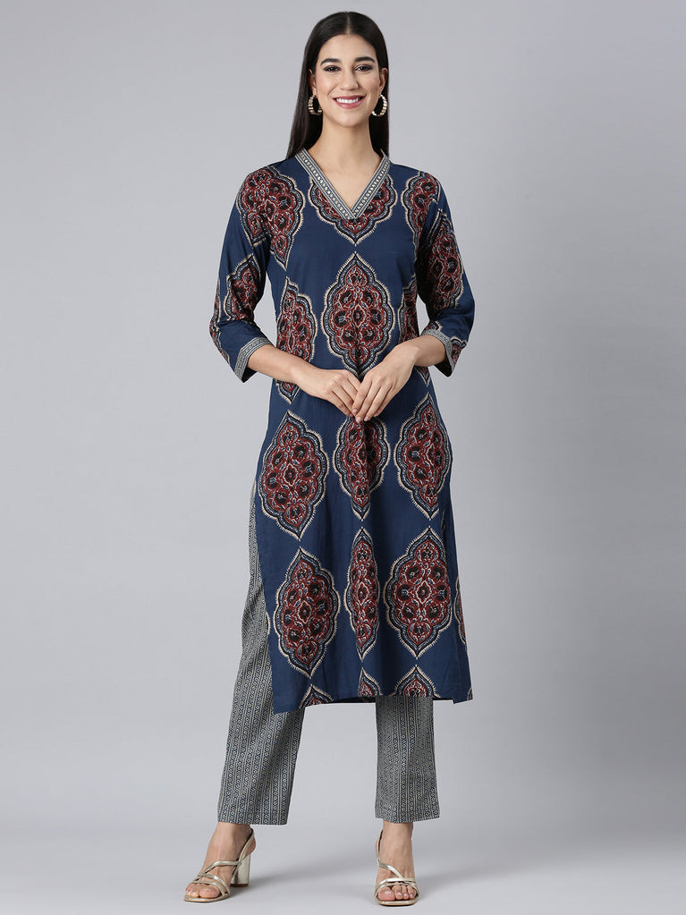 Elevate your ethnic wardrobe with the Neerus Blue Printed Straight Kurta and Trousers set. Crafted with precision, this ensemble features a straight-cut kurta adorned with intricate blue prints, paired with matching trousers for a cohesive look.