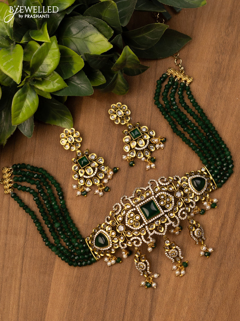 Beaded green choker with kundan & cz stones and beads hanging in victorian finish