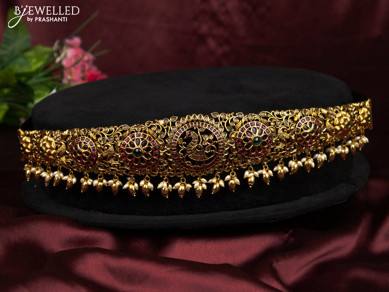 Antique self emboss hip belt peacock with kemp & cz stones pendant and pearl hangings