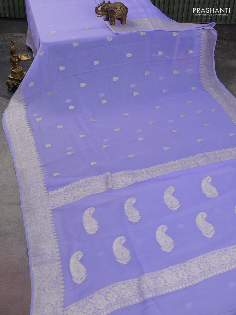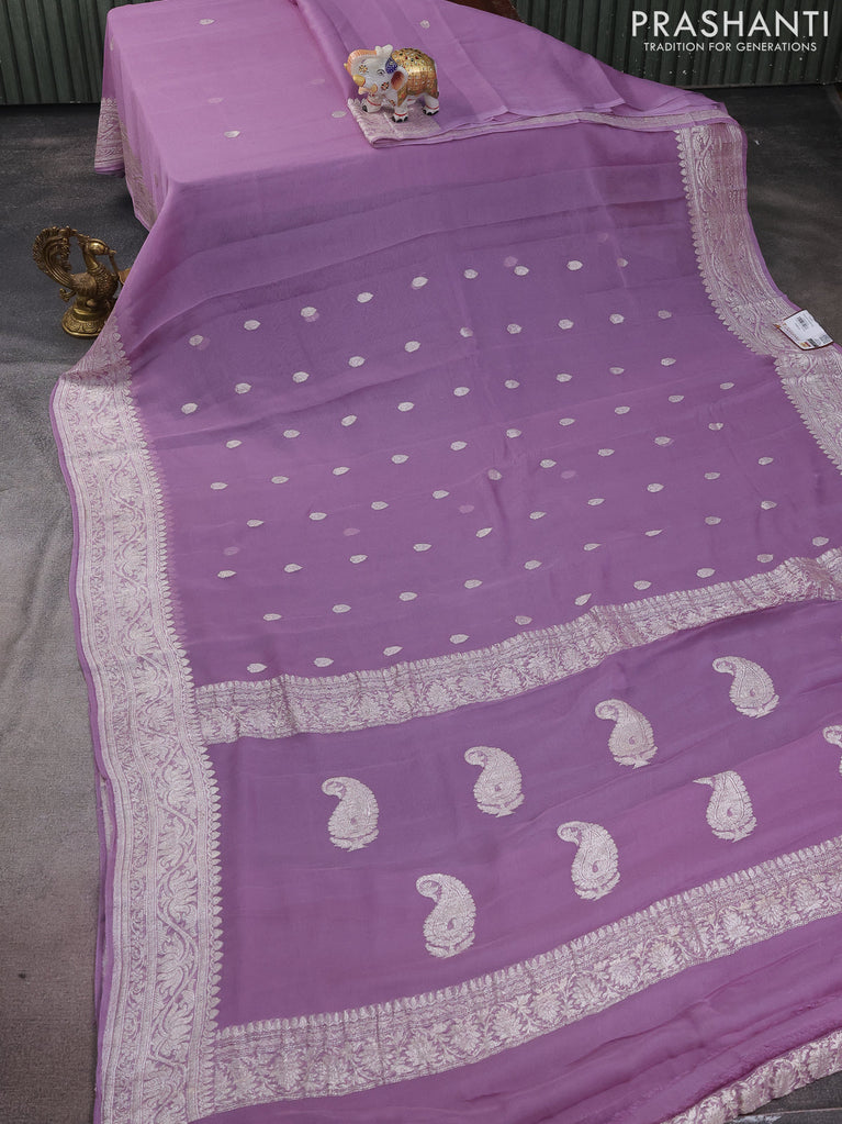 Banarasi chiffon silk saree pastel lavender with silver zari woven buttas and silver zari woven border