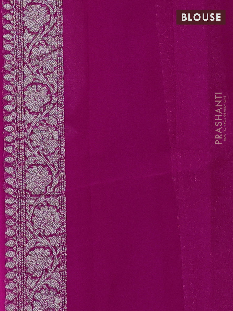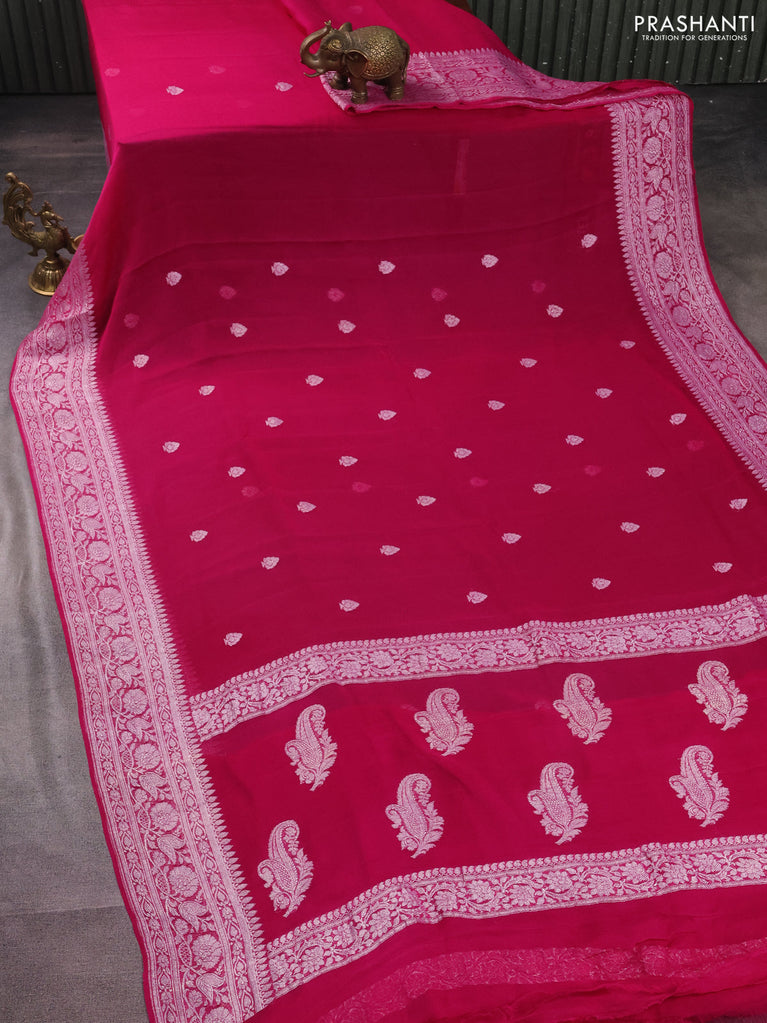 Banarasi chiffon silk saree magenta pink with silver zari woven buttas and silver zari woven border