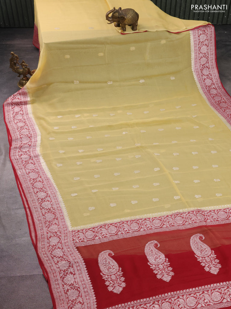 Banarasi chiffon silk saree pale yellow and maroon with silver zari woven buttas and silver zari woven border