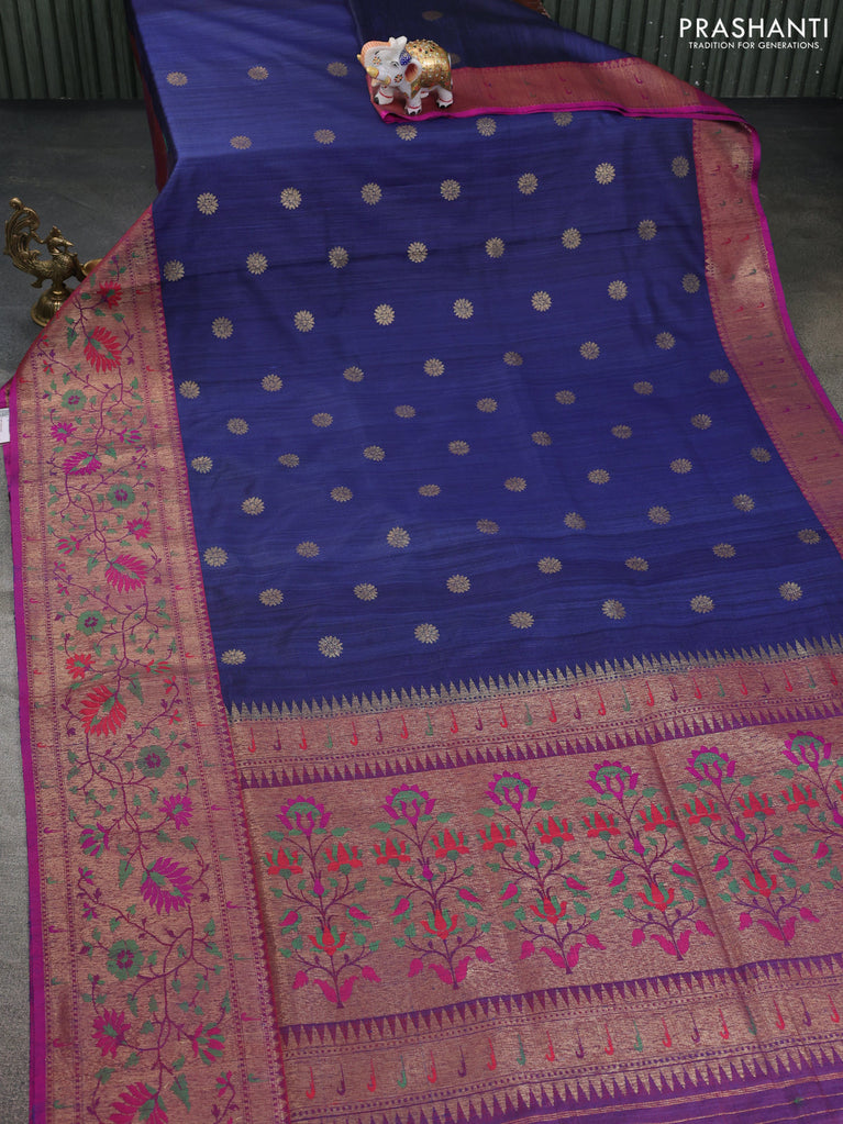 Banarasi handloom dupion silk saree dark blue and purple with thread & zari woven buttas and long rich floral design zari border