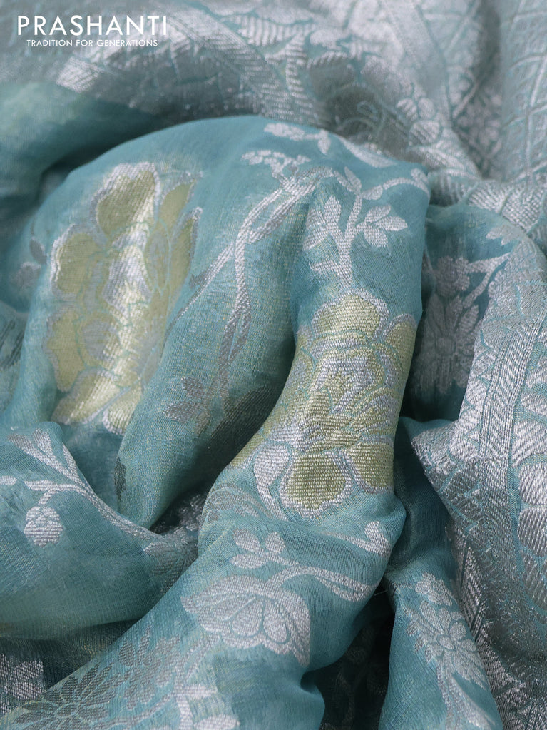 Banarasi georgette tissue saree teal shade and light blue with allover thread & silver zari floral weaves and silver woven border