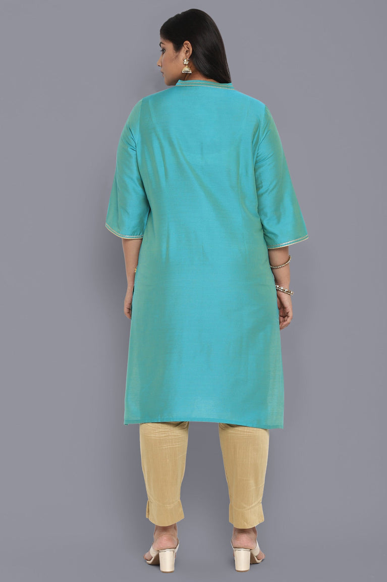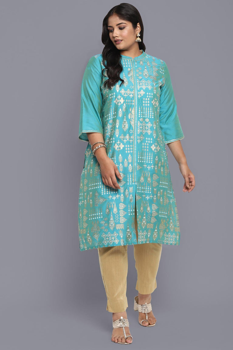 Peacock blue foil print kurta in mandarin neck and three fourth sleeves. It features concealed button placket and side slits.