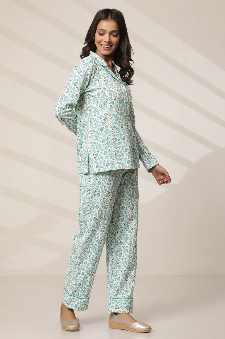 Micro-geometric precision weaving meets comfort in this White and Blue Floral Printed Top and Palazzo lounge wear set. Crafted from 100% pure cotton, this ensemble promises breathability and softness against your skin. The camp neckline and full sleeves add a touch of elegance, while the straight silhouette ensures a flattering fit. Ideal for lazy days at home or a cozy night's sleep, this set is adorned with a delightful floral print. Pair this with comfy footwear and minimal stone stud to complete the look. Embrace the perfect combination of ethnic-inspired design and modern comfort with this versatile set.