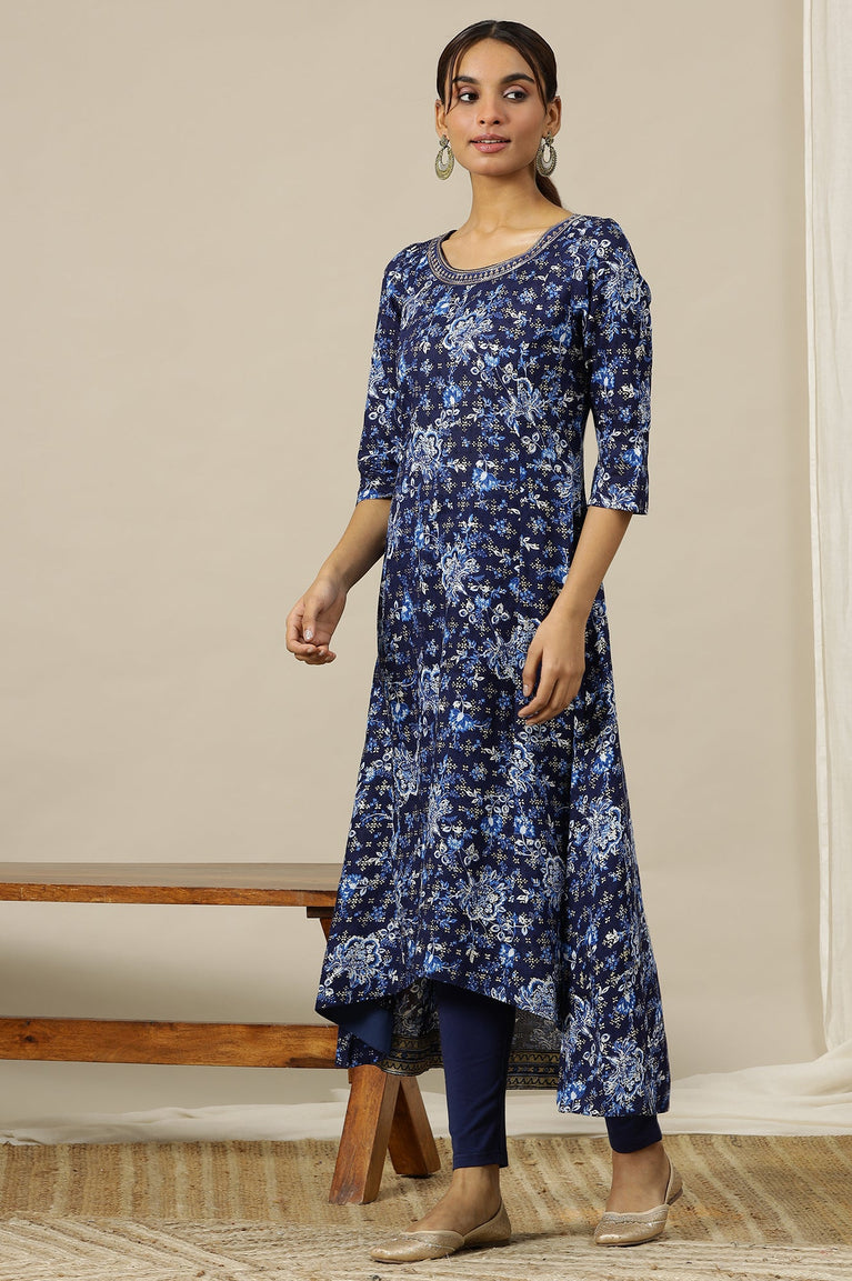 Blue Floral Printed Pure Cotton Flared Kurta with Zari Neckline