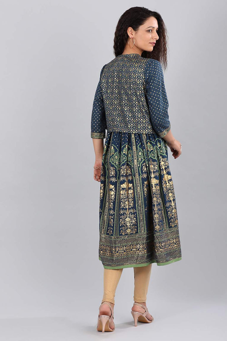 This modern ethnic 2-piece set includes blue coloured Gillet and kurta. This straight Gillet is adorned with floral print and sequin work. And the coordinated sleeveless kurta is solid and has A-line silhouette.