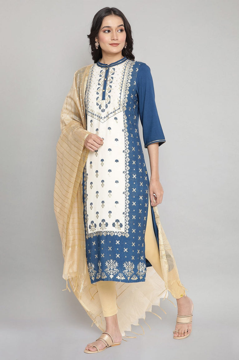Get Ready For A Day Event In This Pretty Aurelia Set. The Set Includes Blue Printed kurta And It Is Paired With White Flared Skirt And Yellow Dupatta.