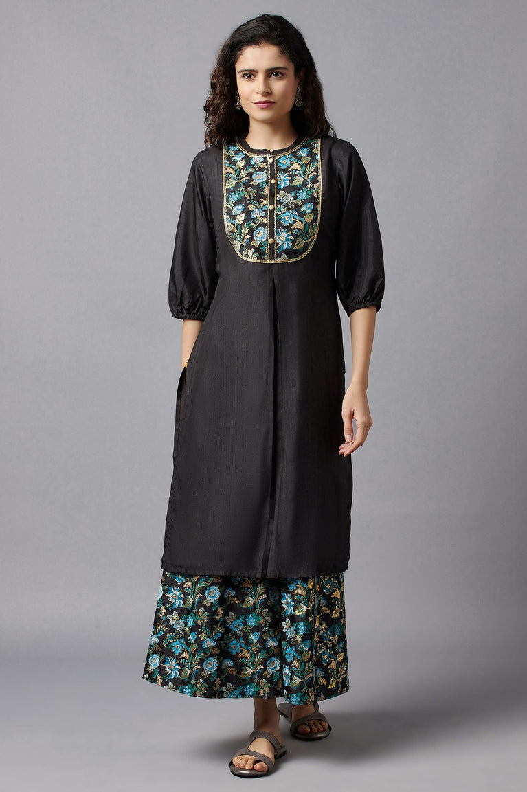 Black coloured straight kurta having ornamenral glitter print, round neck type, three-quarter sleeves and side slits.