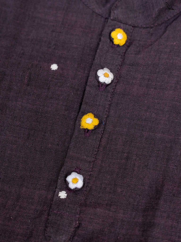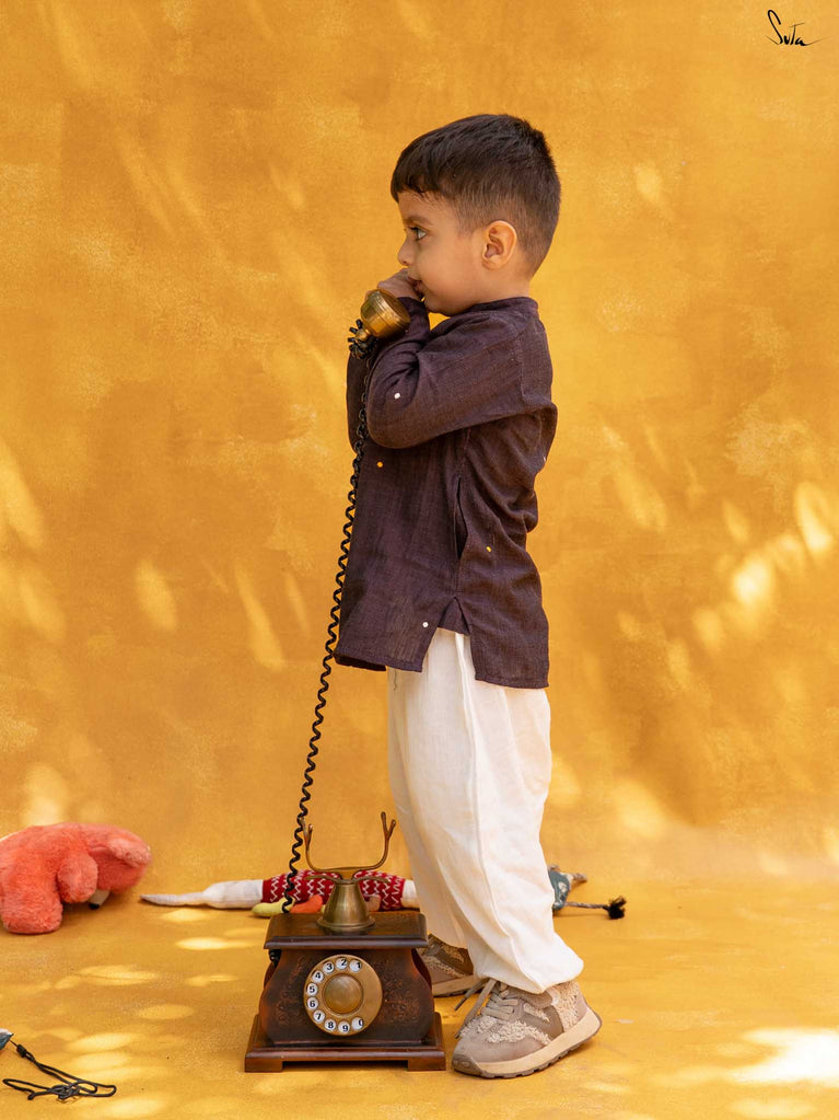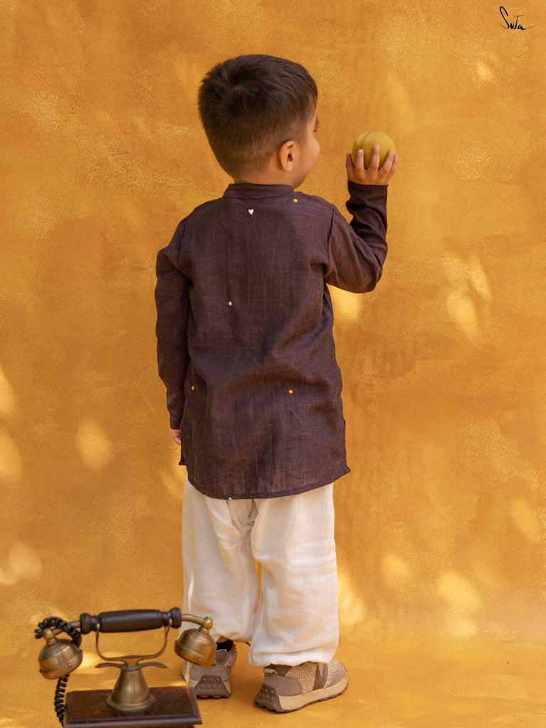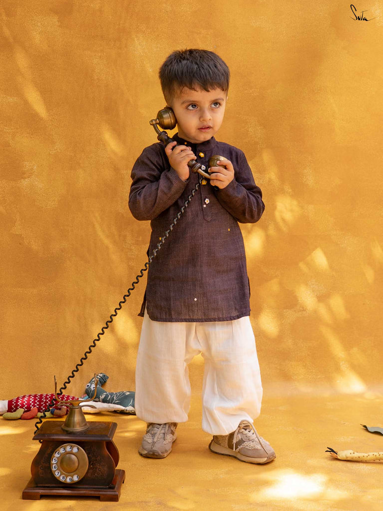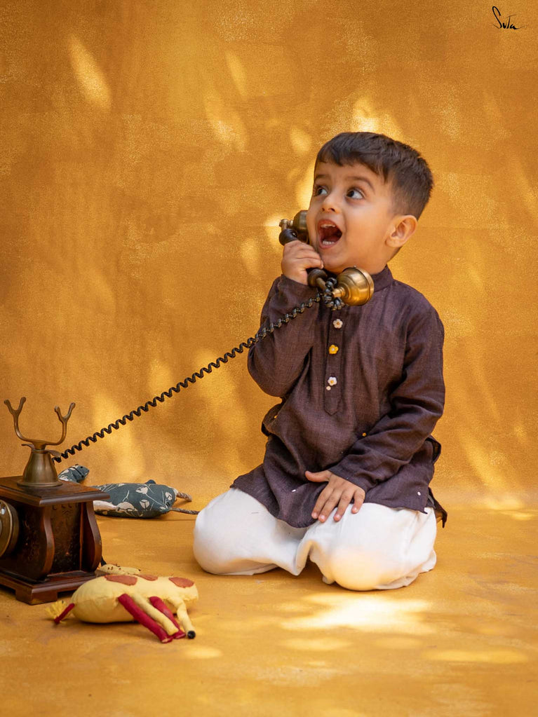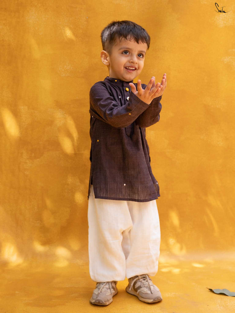 “Rub-a-dub-dub, bubbles and hugs!” A warm cocoa brown kurta that brings bath-time fun to garden play! Made from double-cloth cotton, it features delicate embroidery around the front buttons and sleeve cuffs, tiny twinkles on a traditional base. The contrast white pants are comfy and elasticated, perfect for every bounce, bow, and bubble-blowing goodbye.