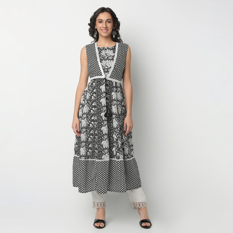 Calf Length Sleeveless Flare Fit All Over Print Kurta