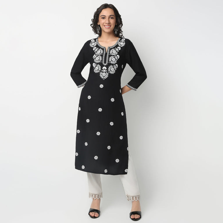 Calf Length Three-Fourth Sleeve Straight Fit Embroidered Kurta