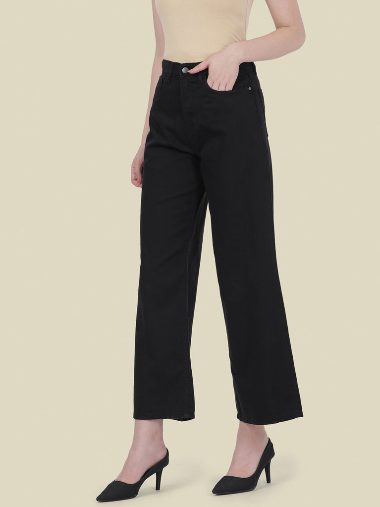 Black Solid Straight Fit Cotton Pants With Button And Zip Closure