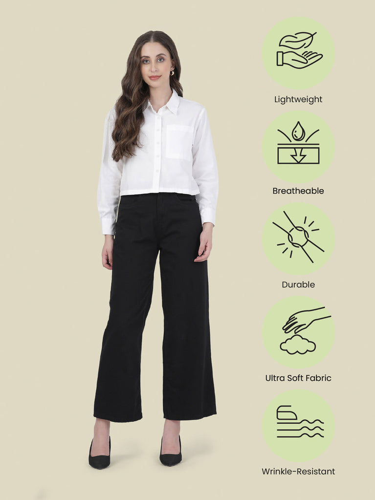 Micro-geometric precision weaving meets modern style in these black flared pants. Crafted from a premium cotton blend, they offer a soft, flexible fit with just the right amount of stretch for all-day comfort. The sleek, ankle-length design is perfect for showcasing your favorite footwear, from sneakers to ankle boots. Pair these versatile trousers with a fitted crop top and a denim jacket for a chic, casual look. Whether you're running errands or meeting friends for lunch, these pants will keep you looking stylish and feeling confident.