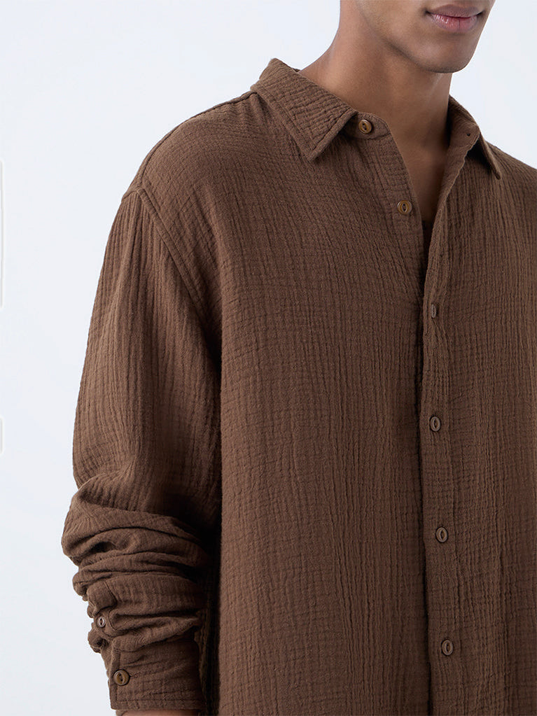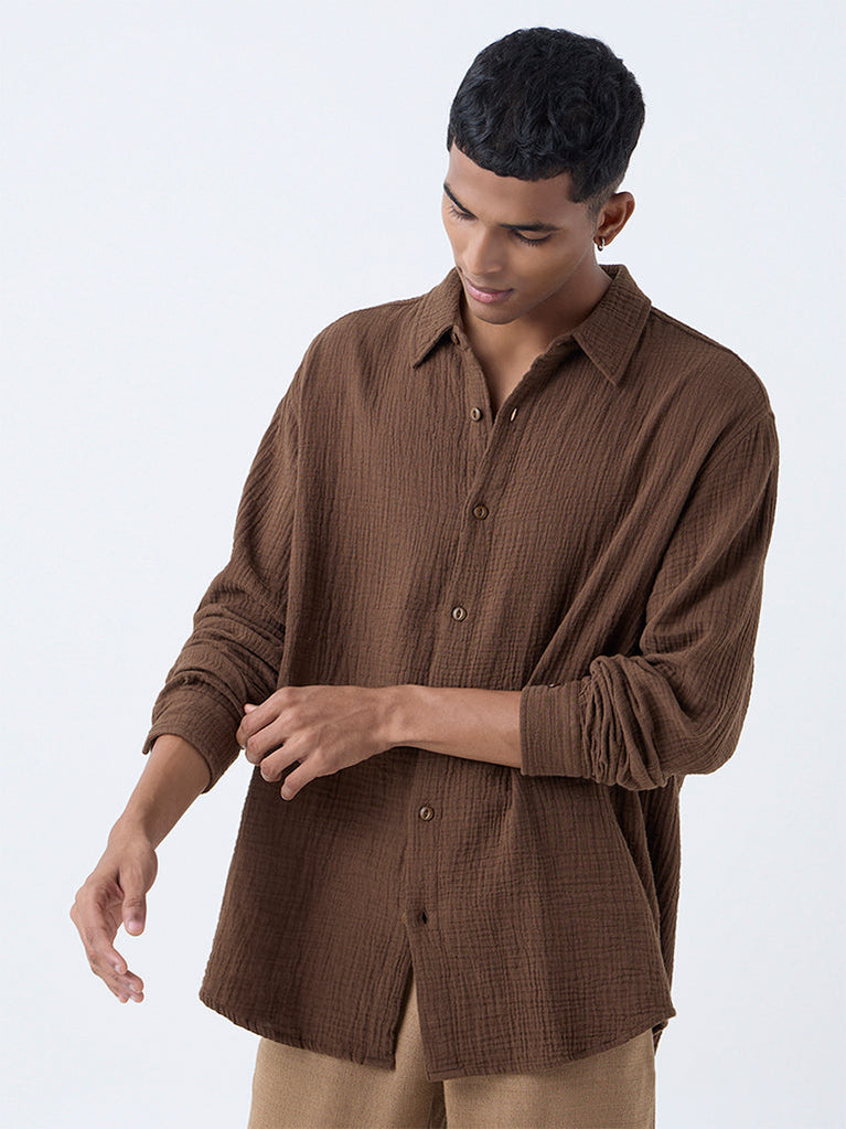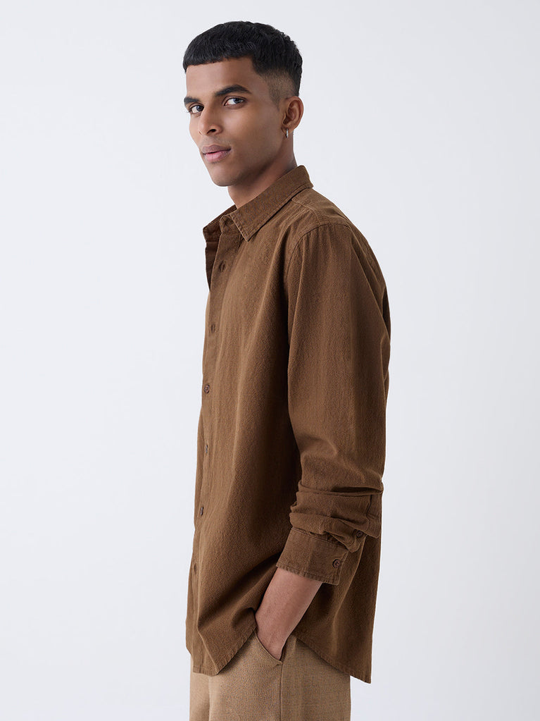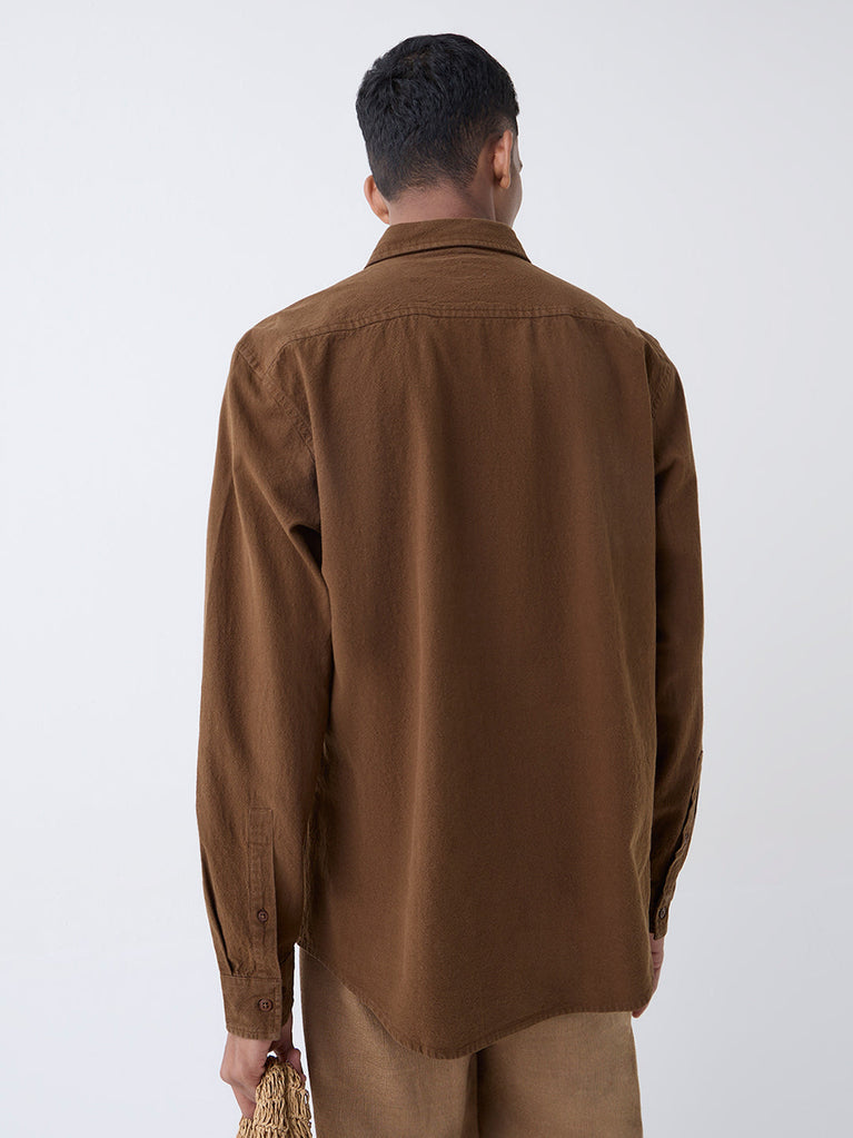 ETA Brown Solid Relaxed-Fit Cotton Shirt