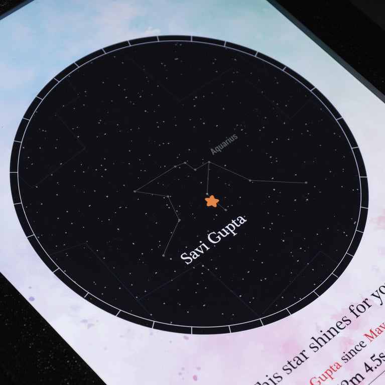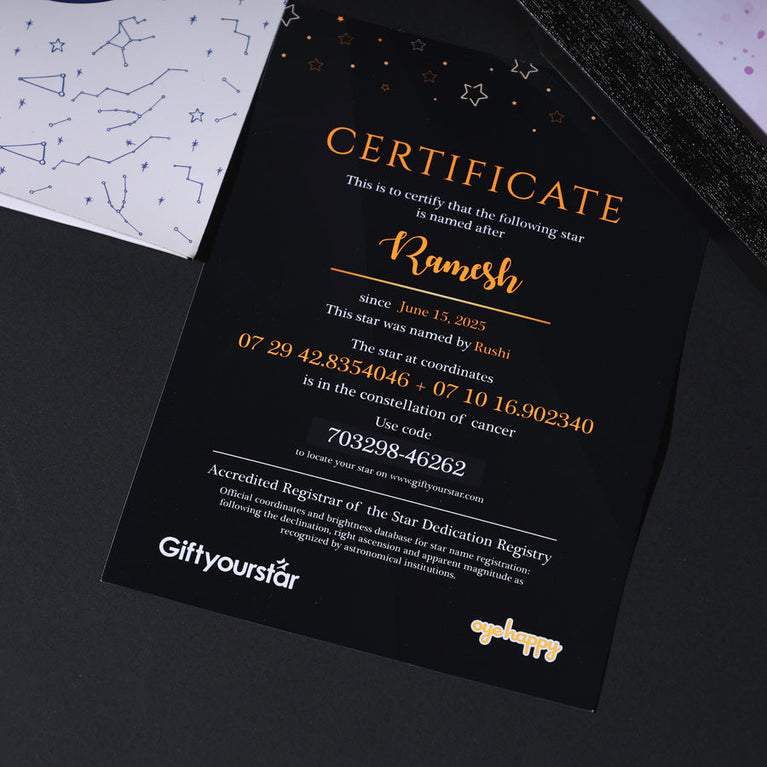 Moms are the guiding light of our lives. They deserve the universe. Let's give them one then.Name a star after your mom and frame it with love, complete with her name and constellation details. Simply share her name, select the zodiac and the date, and a star will be named exclusively for them.The star comes customized with your mother's name and a constellation chart showcasing the exact location of the star. You can also add a personalized message to make it even more touching. How does 'Name a Star' actually work? This unique service utilizes the 'Star Dedication Archive,' a comprehensive database of recognized stars in our solar system with their precise coordinates. Once a star is dedicated, it receives a special name and a certificate is generated for it. The registration number on the certificate provides exclusive access to the star's details in the archive, ensuring that no other star will bear the same name. Specifications -Size of the frame (With acrylic glass): A4.Please note that Oye Happy is a facilitator for the naming service, GiftYourStar, which is an Accredited Registrar of the Star Dedication Archives. The star can only be booked for the current year, not for previous years. If you input the date of the occasion as 17/03/1987, the star will automatically be booked for the current year, regardless of the entered date. If the sender's name is not provided, we will list it as "Star is named by Special Person" on the certificates