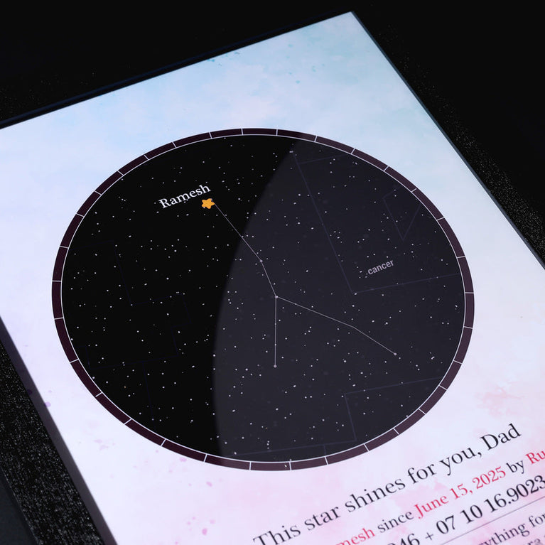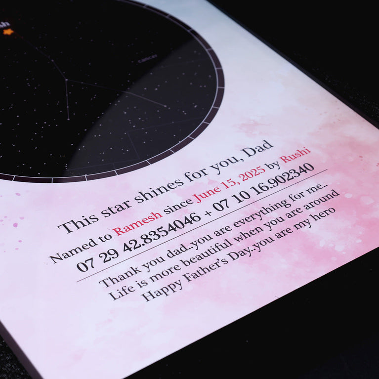 Dads are our real-life superheroes - strong, steady, and always shining. Let’s honour them with something as timeless as their love.Name a star after your dad and surprise him with a gift that’s out of this world. All you need to do is share his name, zodiac, and a special date - and we’ll name a star exclusively for him.The star comes customized with your father's name and a constellation chart showcasing the exact location of the star. You can also add a personalized message to make it even more touching.How does 'Name a Star' actually work?This unique service utilizes the 'Star Dedication Archive,' a comprehensive database of recognized stars in our solar system with their precise coordinates. Once a star is dedicated, it receives a special name and a certificate is generated for it. The registration number on the certificate provides exclusive access to the star's details in the archive, ensuring that no other star will bear the same name.Specifications :Size of the frame (without glass) - A4