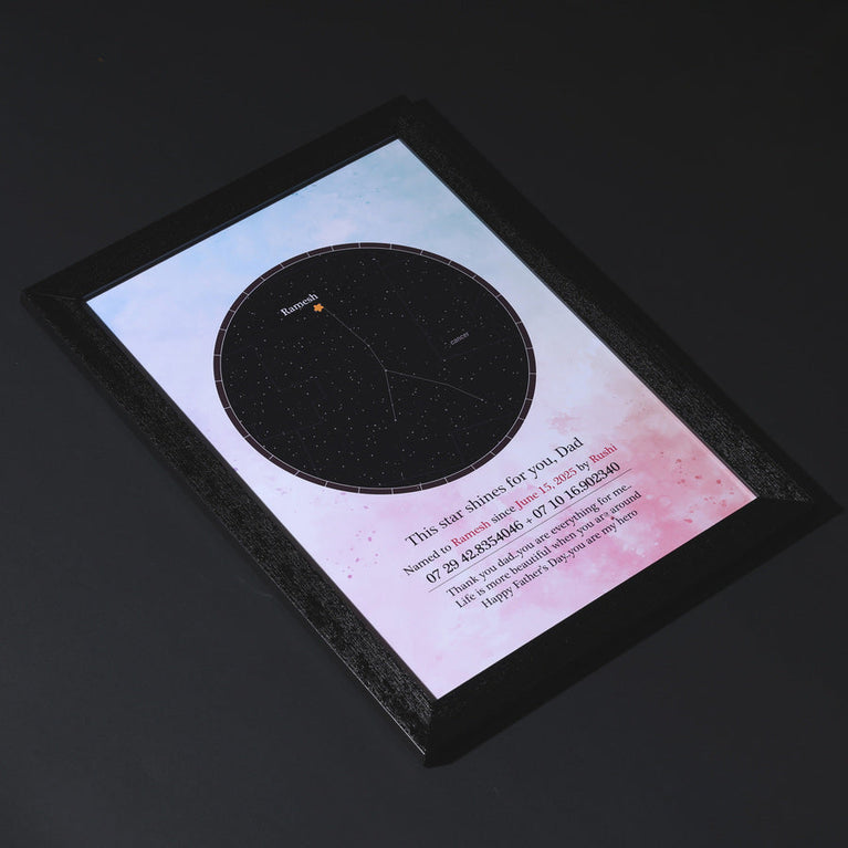 Dads are our real-life superheroes - strong, steady, and always shining. Let’s honour them with something as timeless as their love.Name a star after your dad and surprise him with a gift that’s out of this world. All you need to do is share his name, zodiac, and a special date - and we’ll name a star exclusively for him.The star comes customized with your father's name and a constellation chart showcasing the exact location of the star. You can also add a personalized message to make it even more touching.How does 'Name a Star' actually work?This unique service utilizes the 'Star Dedication Archive,' a comprehensive database of recognized stars in our solar system with their precise coordinates. Once a star is dedicated, it receives a special name and a certificate is generated for it. The registration number on the certificate provides exclusive access to the star's details in the archive, ensuring that no other star will bear the same name.Specifications :Size of the frame - A3 without Glass (29.72 x 41.91 cm)