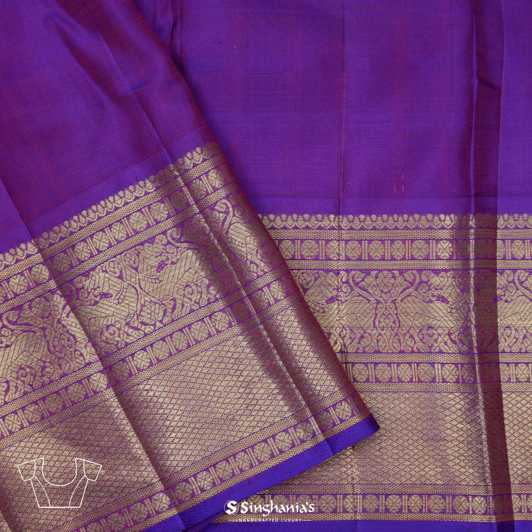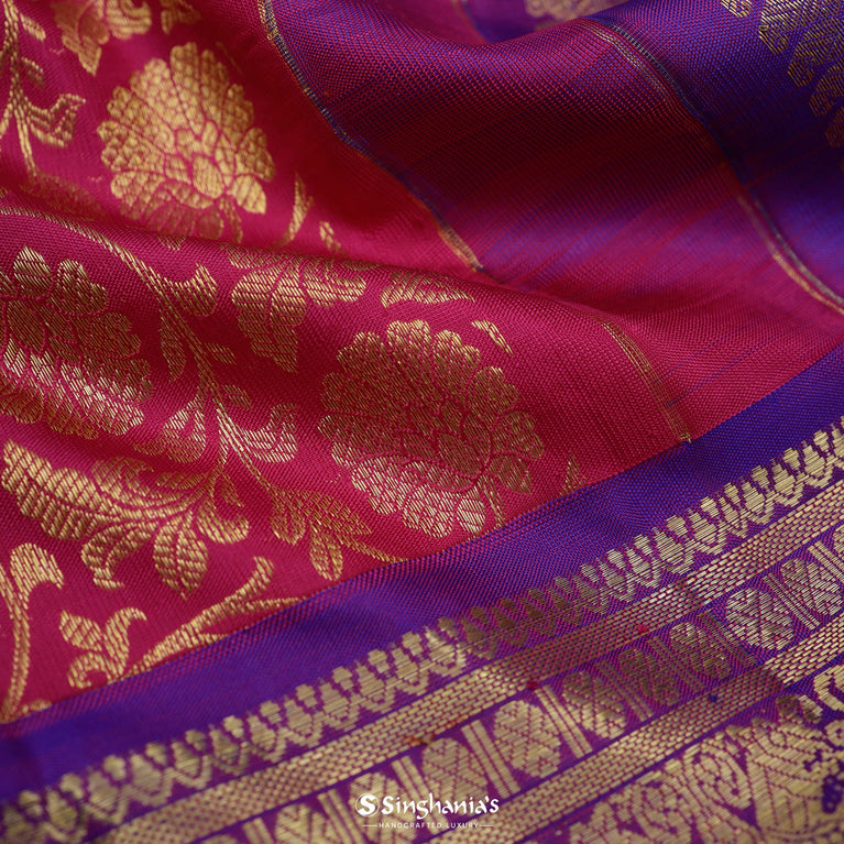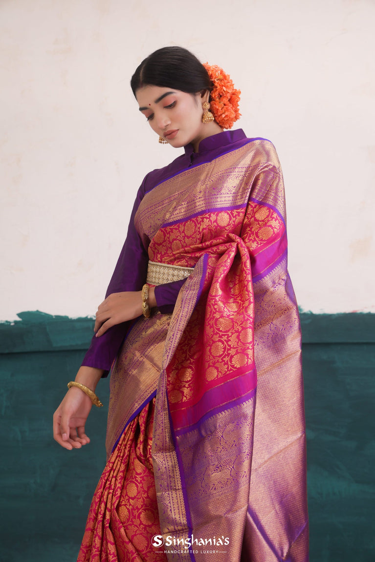 Beguiling in the shade of this Cherry Pink Kanjivaram Silk Saree with floral jaal pattern all across the body, which is teamed with contrast purple and gleaming gold zari woven floral motif pattern in the border and pallu.