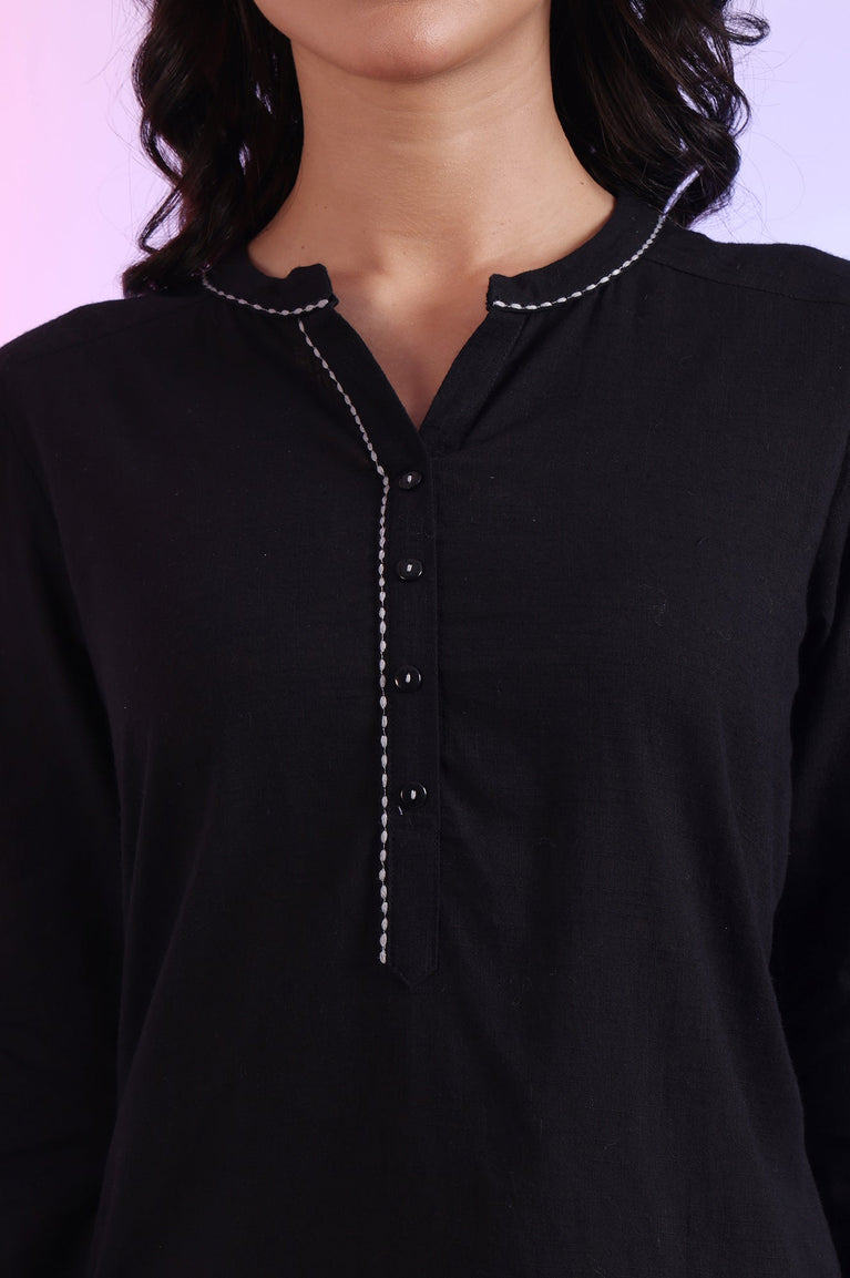 Experience the perfect blend of comfort and style with Aurelia's fusion kurti. This mid-thigh length kurti features a band neckline and three-quarter sleeves, making it ideal for casual wear. Crafted from pure cotton, it ensures breathability and softness against your skin. The black hue adds versatility to your wardrobe, while the straight cut and slit detail enhance its contemporary appeal. This woven kurti is designed for the modern woman who values both tradition and trend. The 100% cotton composition guarantees durability and easy maintenance. Whether you're running errands or meeting friends for a casual outing, this kurti will keep you looking effortlessly chic. Its fusion ethnicity allows for versatile styling options, making it a must-have addition to your wardrobe. Aurelia's attention to detail and quality craftsmanship shines through in this piece, offering you a perfect balance of comfort and fashion.