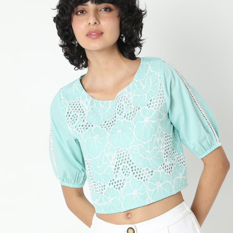 This solid pattern crop top has a u neck and short sleeve. Made from cotton, it is soft and comfortable to wear.