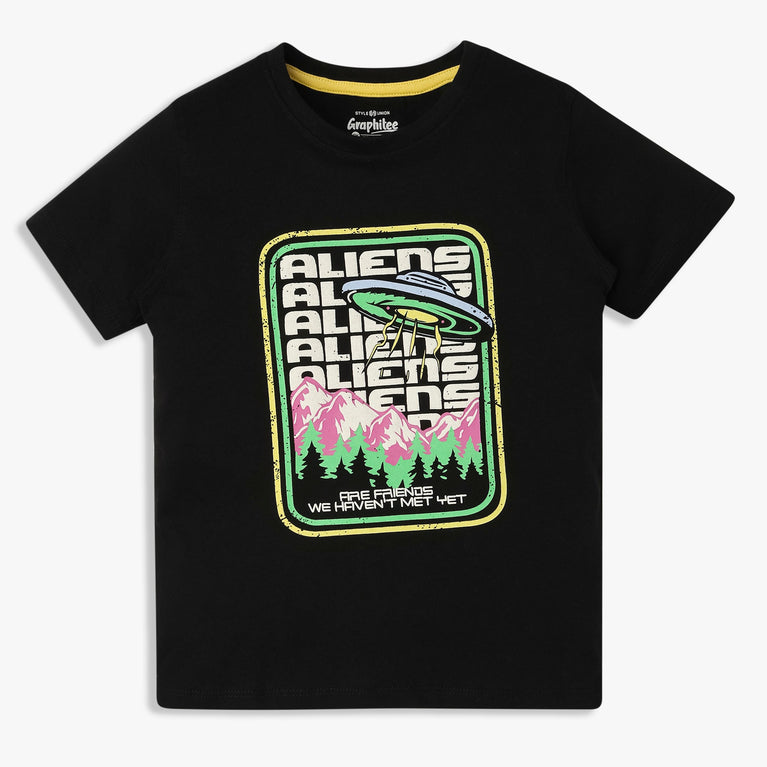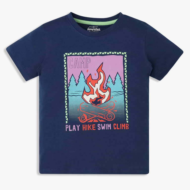 Introducing the Boy's Cotton Crew Neck Graphitee T-Shirt, a perfect blend of comfort and style for young adventurers. Made from soft cotton, this t-shirt features a vibrant graphic design, making it a standout piece in any boy's wardrobe.