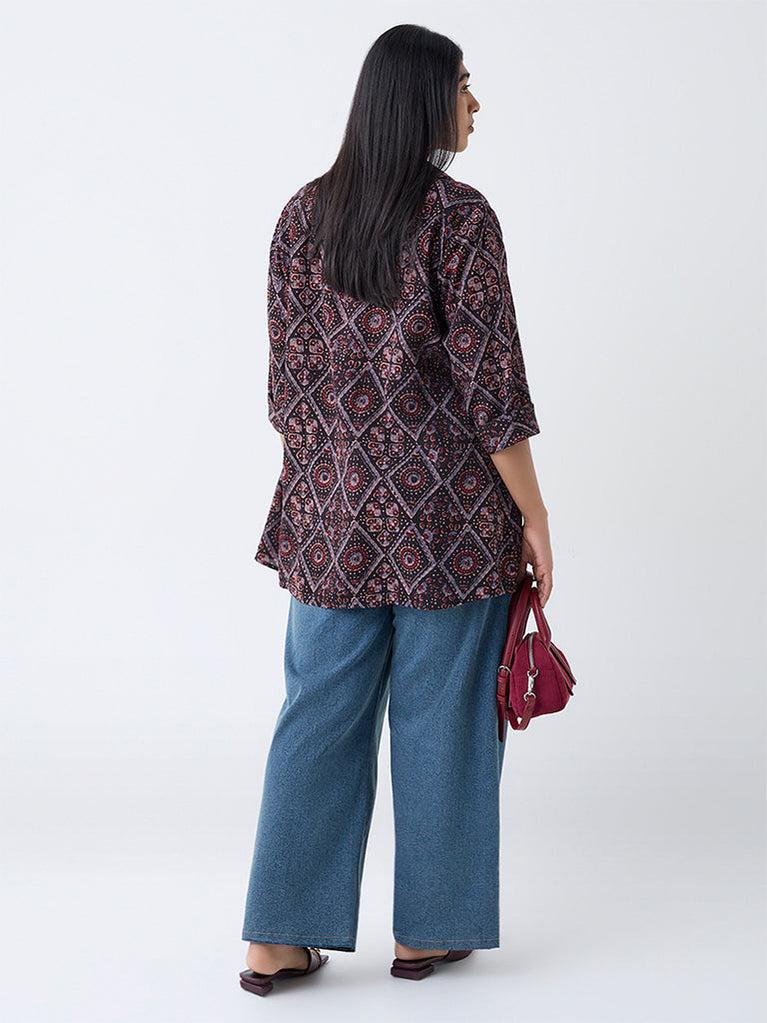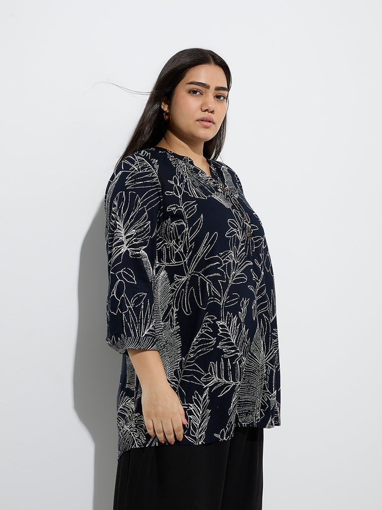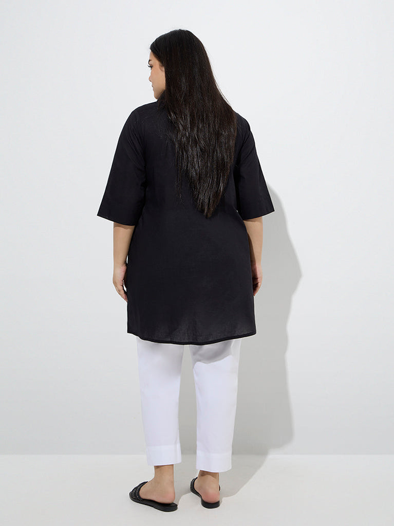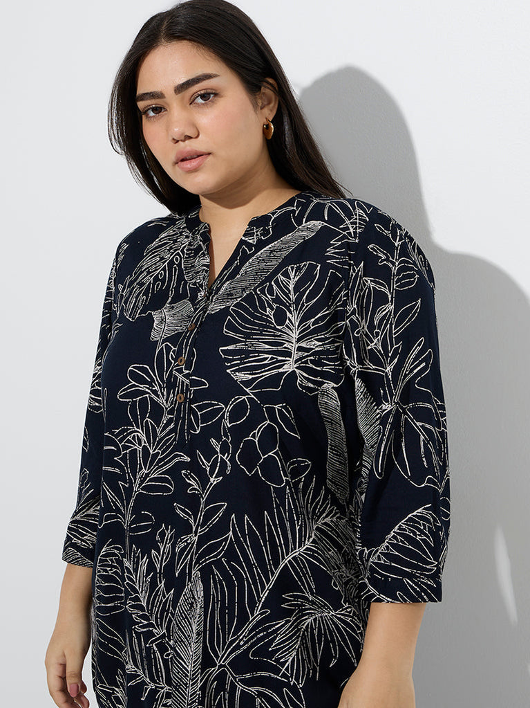 Quietly expressive, this black tunic from Diza is adorned with all-over foliage prints that add timeless charm. Cut from a lightweight fabric that drapes smoothly, it features a spread collar and three-quarter sleeves—an easy, versatile pairing for relaxed ethnic separates.