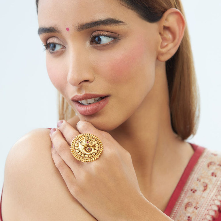 Intricate, festive, and contemporary, this fine ring is all. Adding a refreshing feel of full bloom, the white pearls, embossed gold plated floral design, floral rim, and hint of ruby stone, makes your look more exquisite and unique.