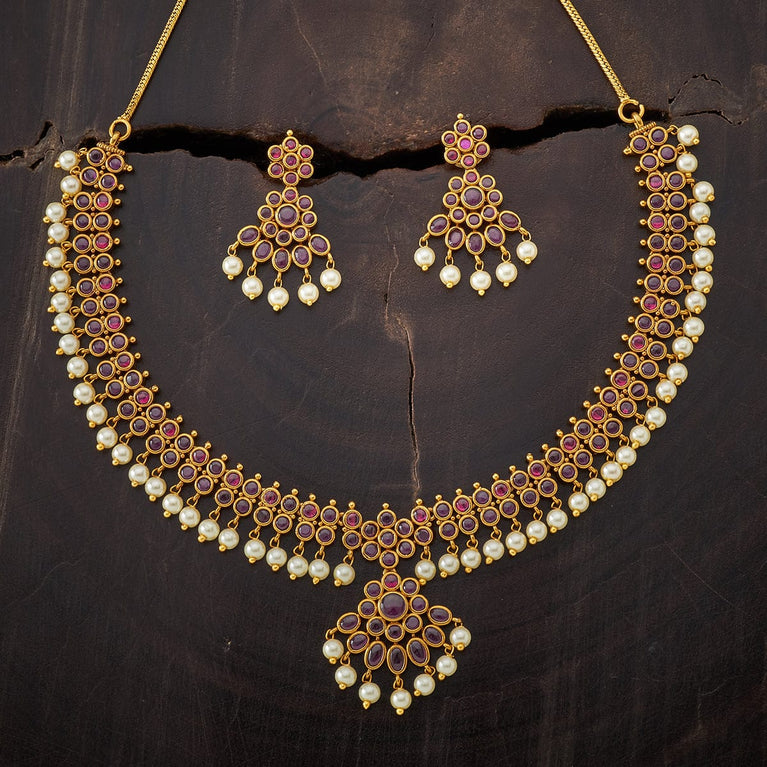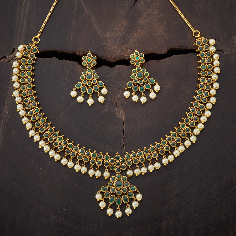 Kushal's Ruby & Green Festive Long Necklace With Stones & Beads This gold-plated long necklace with jhumka earrings looks absolutely stunning. The jewellery set has an antique feel and will look great with ethnic outfits. The jhumkas have white pearl hangings that make it look very elegant. The traditional appearance of the jewellery set makes it perfect to be worn with saree and ghagra choli.