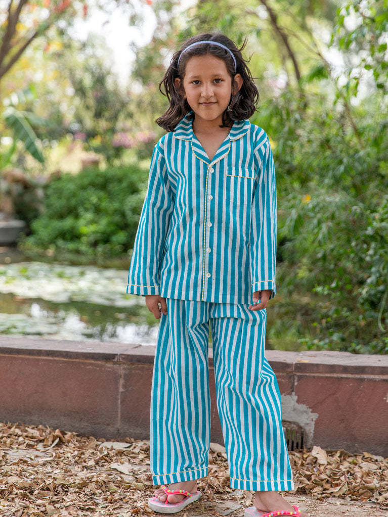 Turquoise Stripes Block Printed Cotton Top & Pyjama Set