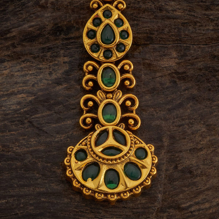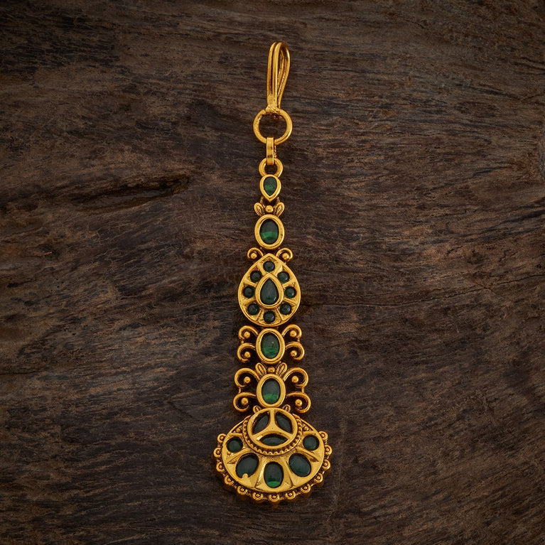 Kushal's Fashion Jewellery Flower Motif Antique TikkaThis antique tikka, which has a base metal composition of copper alloy, is quite attractive. It gives you a mesmerizing look because of its white pearls and green zircon stones. Put it on with any traditional clothing to put a smile on your face. This tikka, which has a chand bali-like appearance, is something you shouldn't miss.