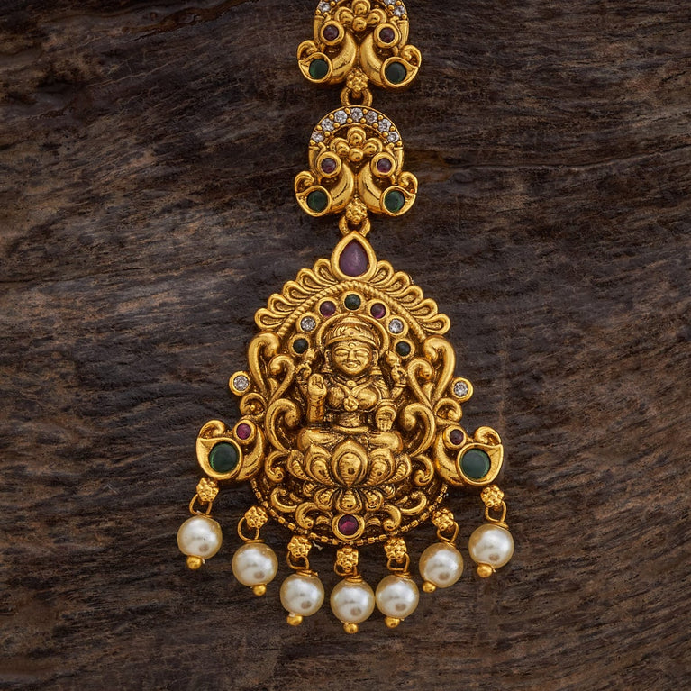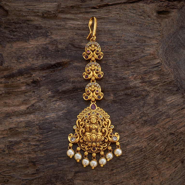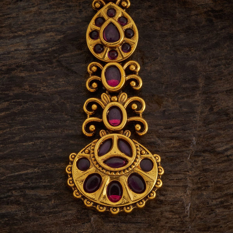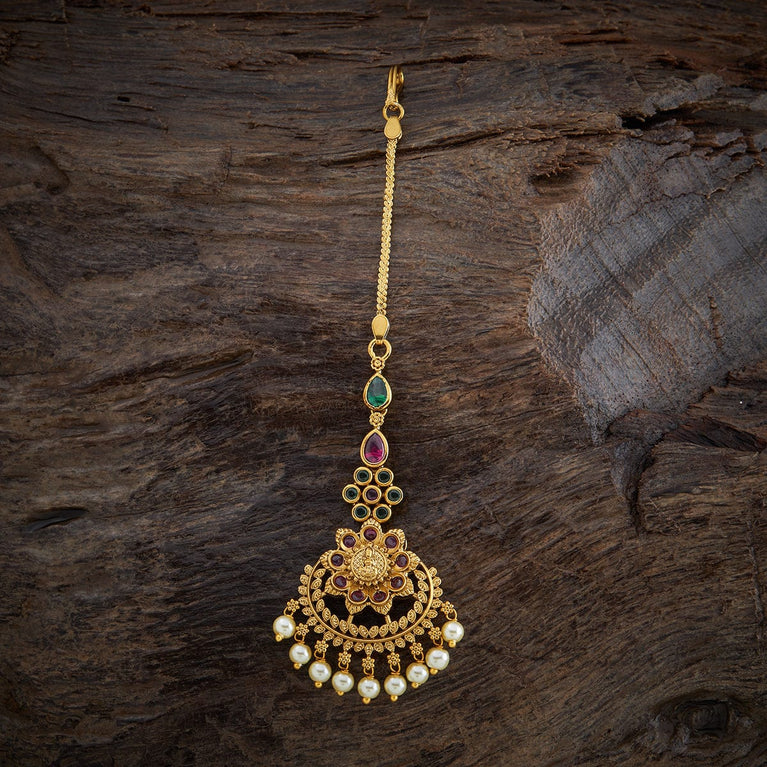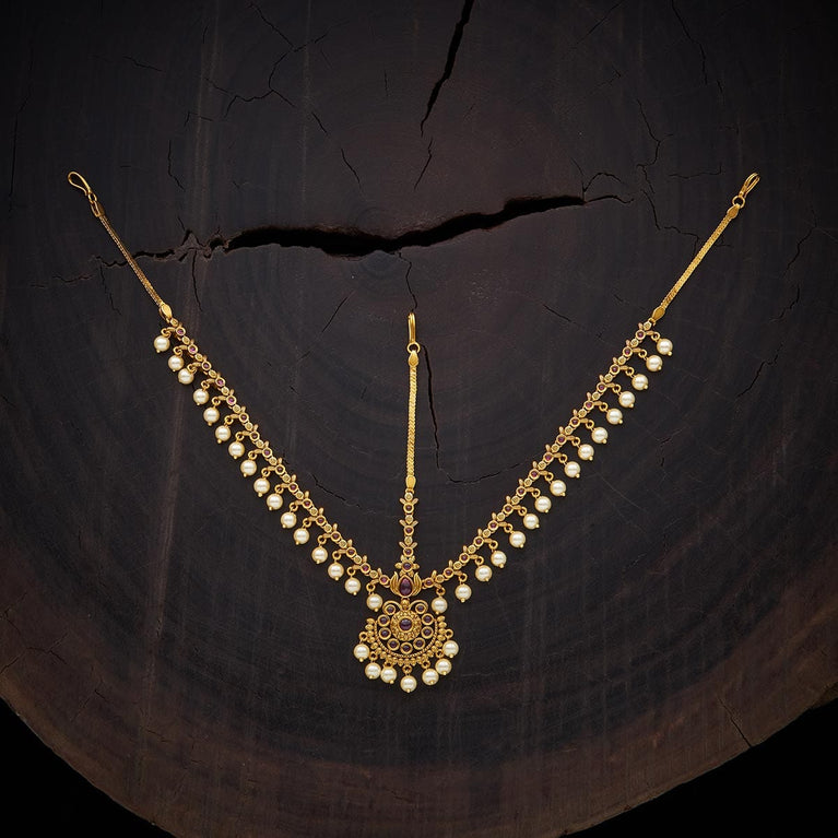 Kushal's Fashion Jewellery Flower Motif Antique TikkaLooking for some beautiful hair accessories for a traditional event? This antique Tikka is a perfect piece to add to your traditional look. The floral carving and tiny leaf design embellished with Ruby stones and hanging pearls are alluring enough for a stunning presence. Style it with loose hair or any other hairstyle and impress everyone on this festive occasion.
