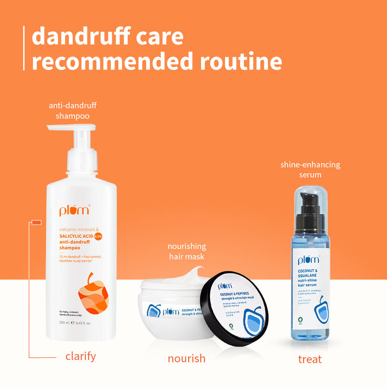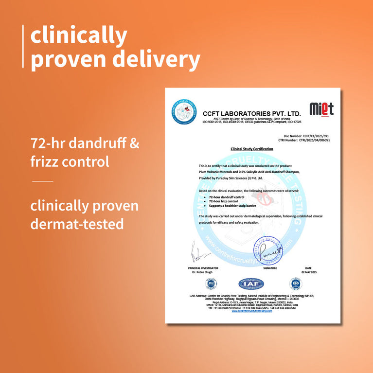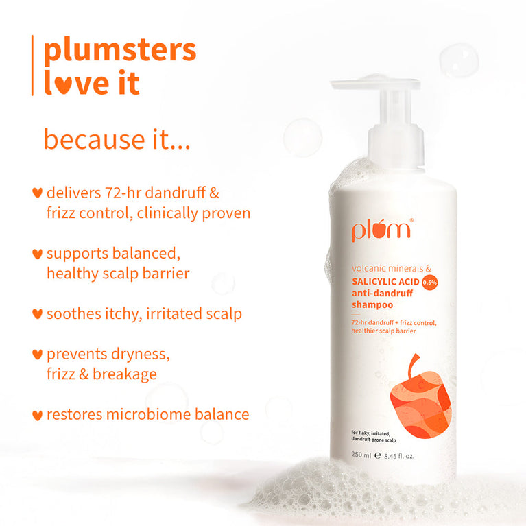 72-HR DANDRUFF & FRIZZ CONTROL: This high-performance anti dandruff clarifying shampoo combines 0.5% Salicylic Acid to gently exfoliate scalp buildup, loosen flakes, and clear clogged follicles, thereby tackling dandruff at the root. The protein-rich Amino Acid blend strengthens hair from within and smoothens cuticles, visibly reducing frizz and breakage. Because real results begin with smart chemistry.MAINTAINS HEALTHY SCALP BARRIER: This shampoo for oily scalp is made with Piroctone Olamine - a gentler anti-fungal that targets dandruff-causing Malassezia without messing with your scalp’s natural balance & It’s also infused with prebiotics to feed the good bacteria and keep your scalp barrier strong, calm, and happy.SOOTHES ITCHINESS & IRRITATION: If dandruff’s making your scalp itch and sting, this clarifying shampoo steps in to calm things down. Volcanic Minerals help clarify and remineralize the scalp with magnesium and calcium to calm discomfort, while Niacinamide visibly reduces redness from dandruff flare-ups.PREVENTS ROUGHNESS & DRYNESS: Packed with a protein-rich Amino Acid blend, this shampoo for dry & frizzy hair strengthens hair from the inside out, restores elasticity, and smoothens the cuticle, so frizz stays down and shine shows up.