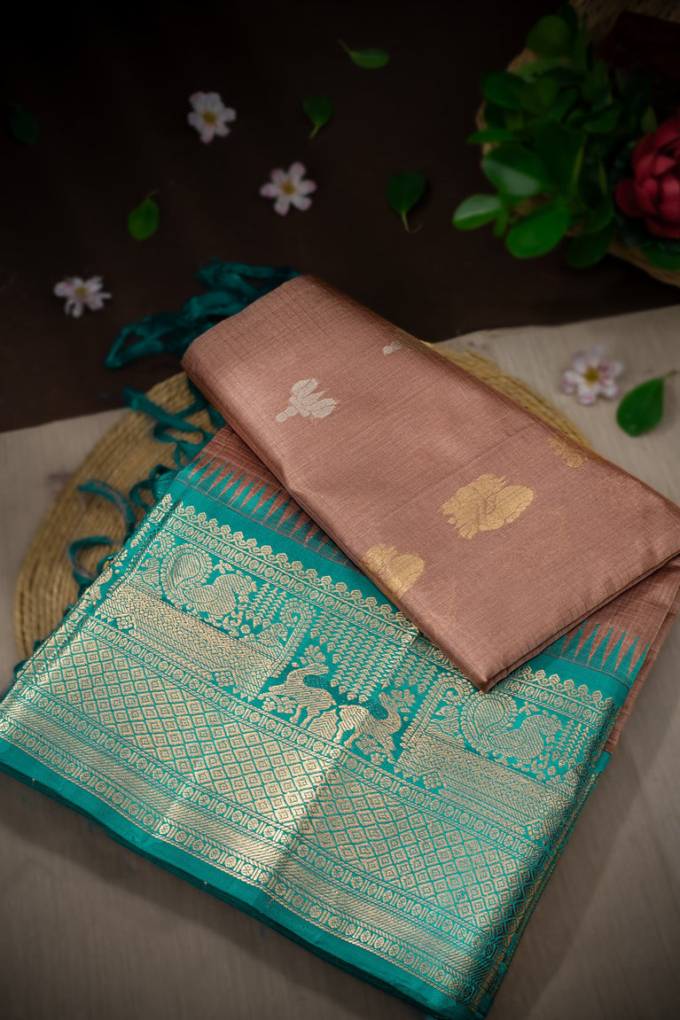 Mandir Rosewood Pink & Teal Kuppadam Buttis Saree