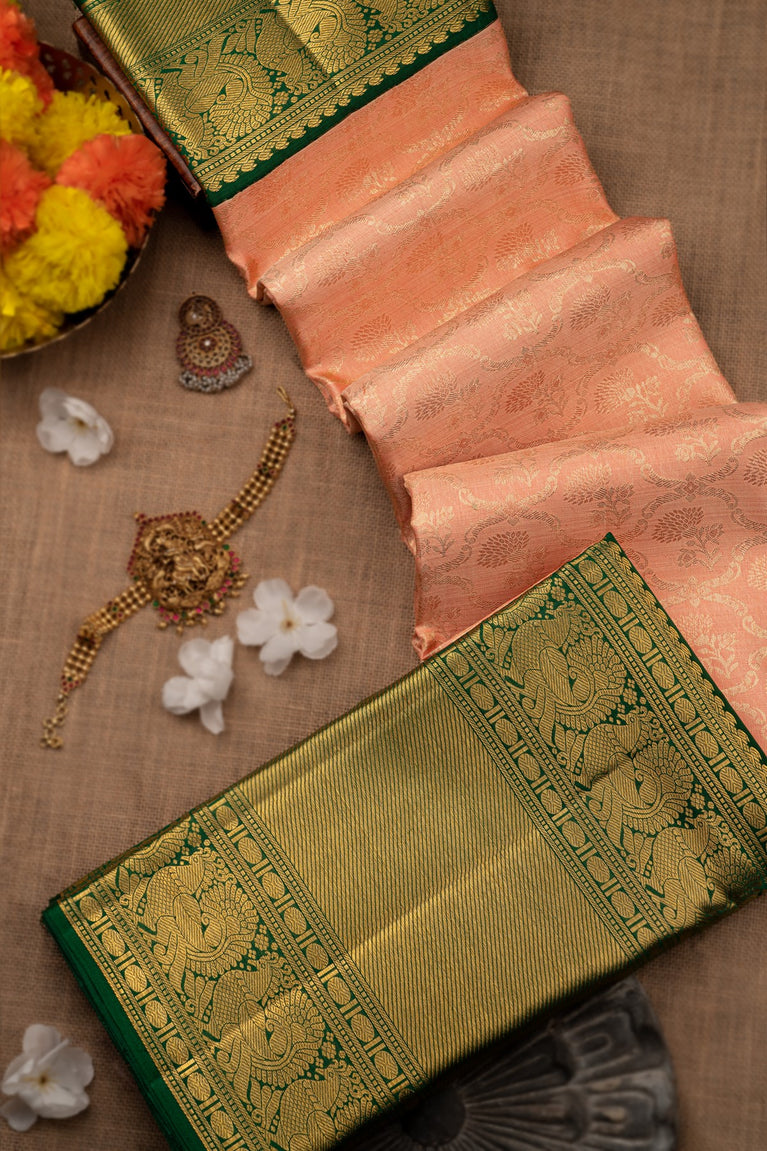 Mandir Light Peach & Green Kanchipuram Floral Jaal Saree