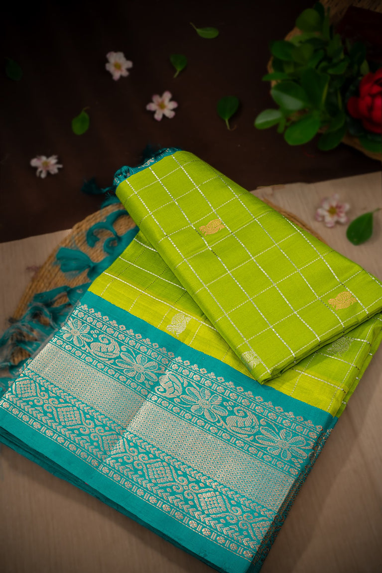Mandir Lime Green & Sea Green Kuppadam Checks And Buttis Saree