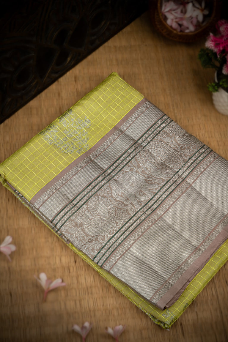 Mandir Lime Yellow & Light Grey Uppada Checks And Buttis Saree