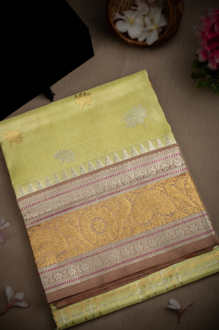 Mandir Lime Yellow & Light Brown Venkatagiri Checks And Buttis Saree