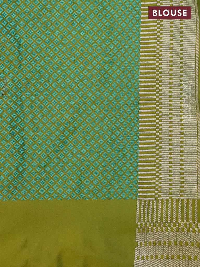 Banarasi semi mushru silk saree dual shade of mustard and teal green shade with allover self emboss and zari woven border