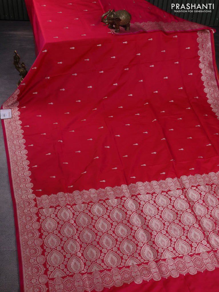 Banarasi semi mushru silk saree pink shade and red with allover self emboss & zari buttas and zari woven border