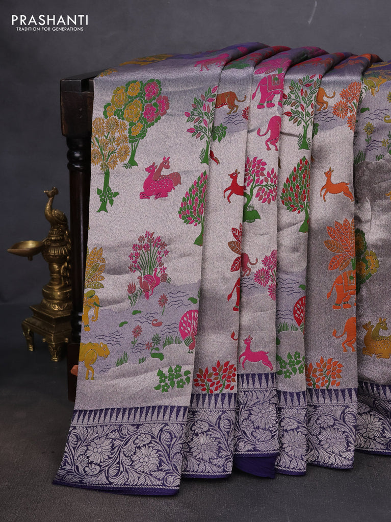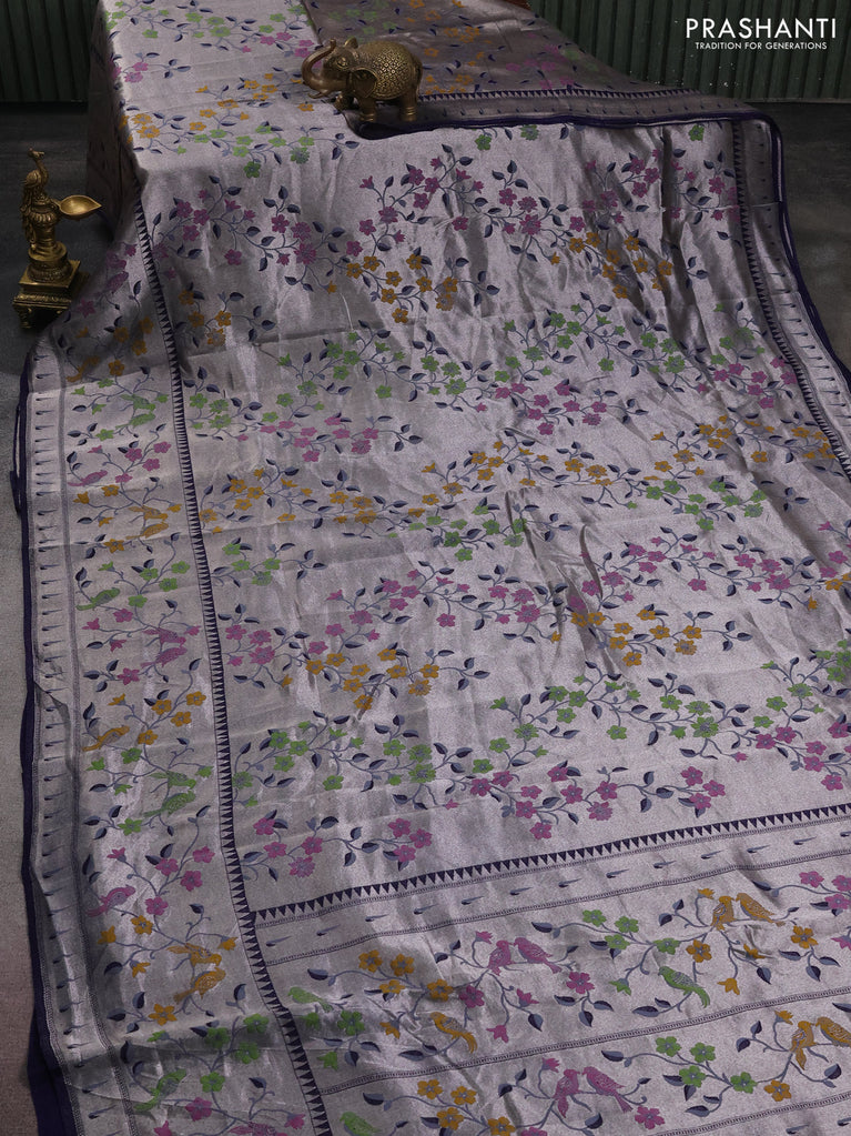 Banarasi semi raw silk saree lavender with allover silver zari woven paithani weaves and woven border