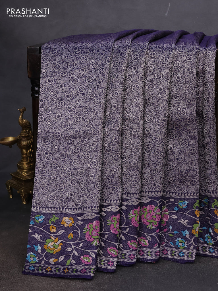 Banarasi semi raw silk saree lavender with allover silver zari woven floral weaves and floral design paithani border