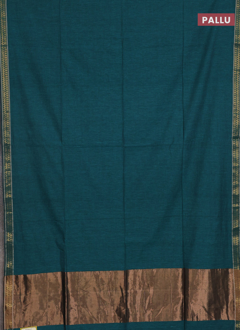 Bengal soft cotton saree teal green shade with plain body and zari woven piping border