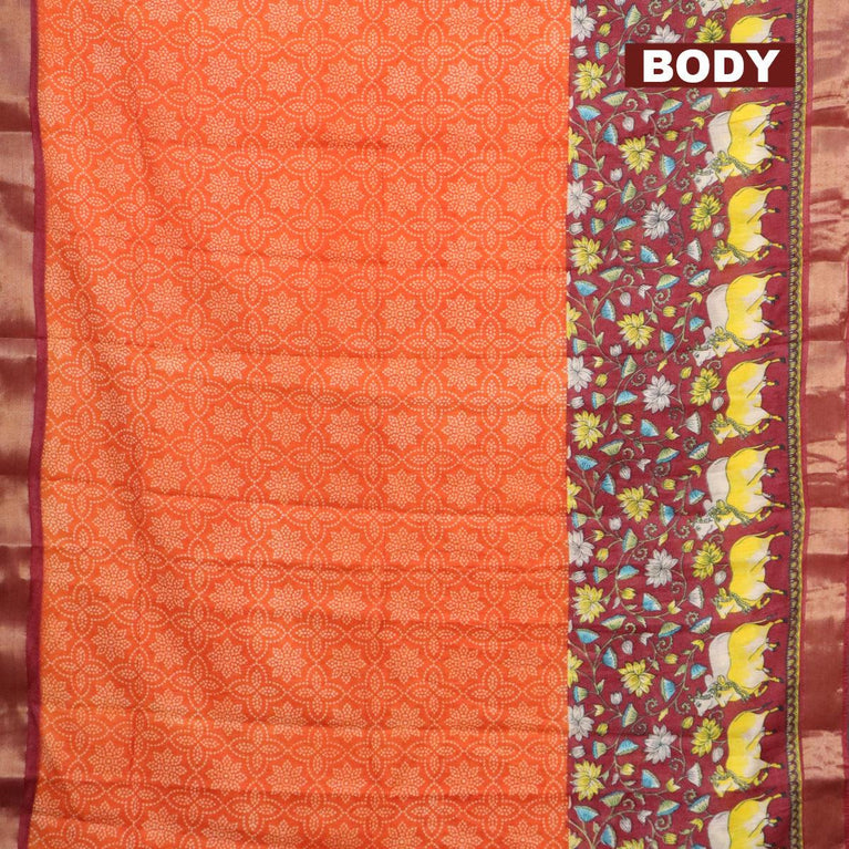Bhagalpuri saree orange and maroon with allover bandhani prints and long pichwai printed zari woven border