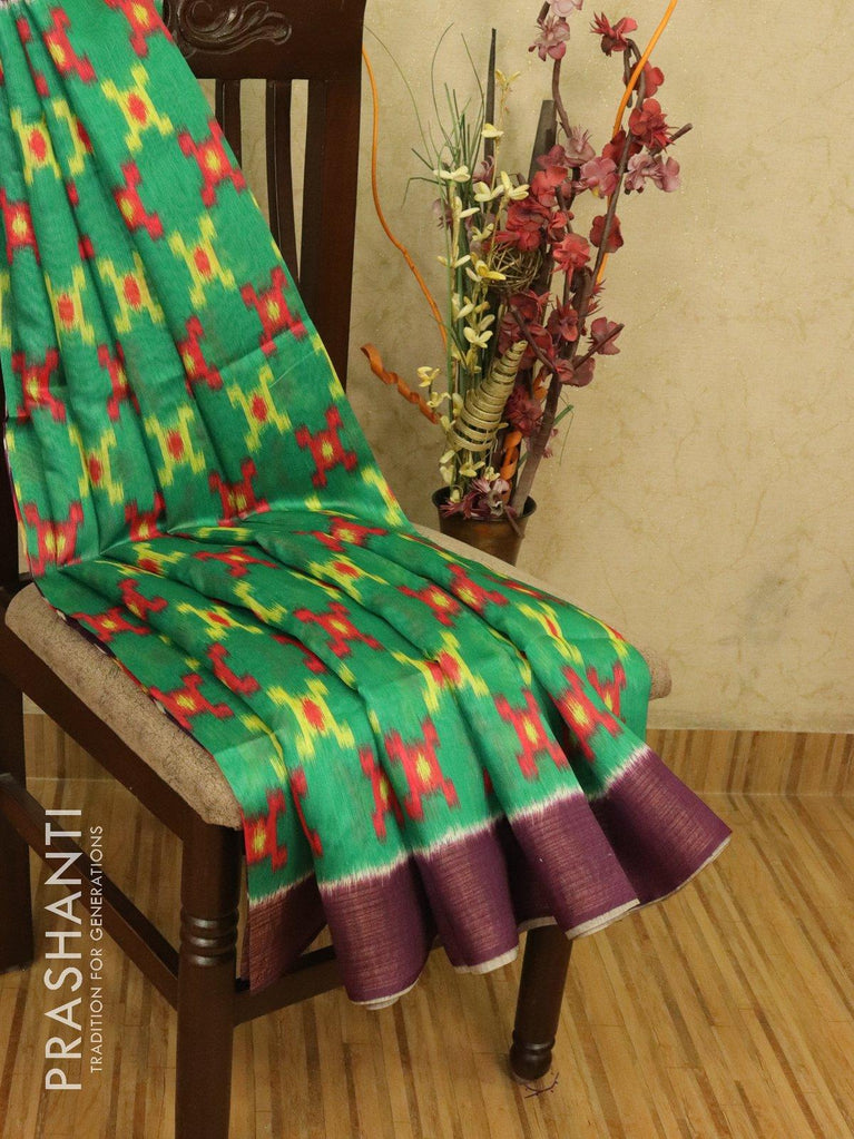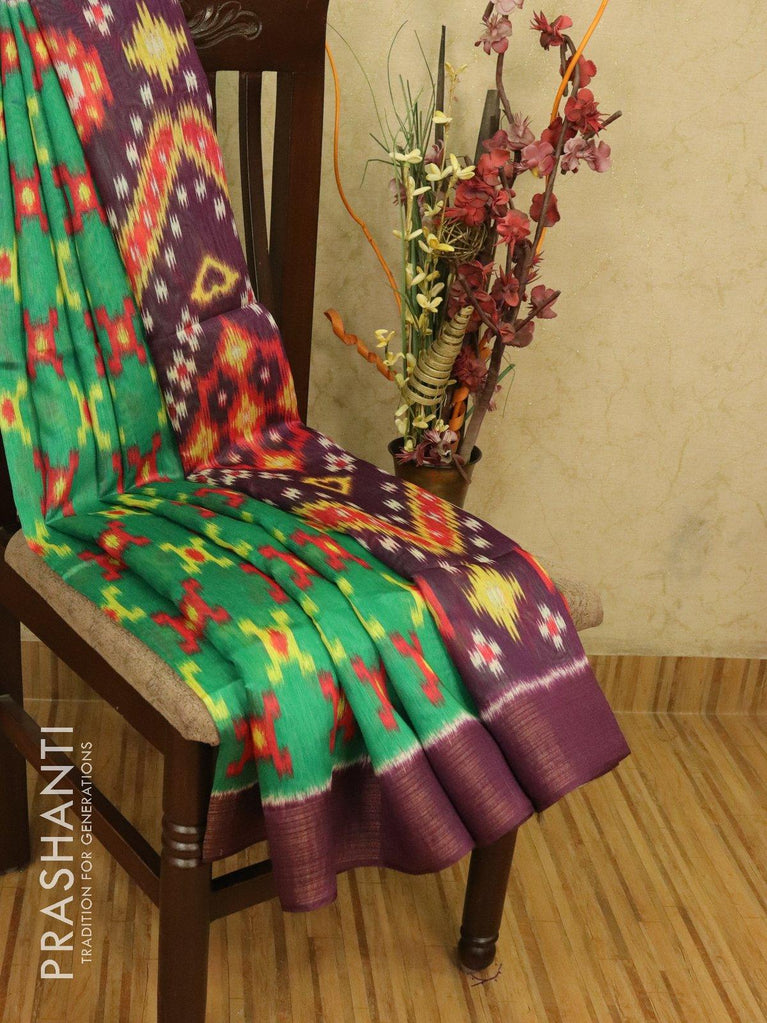 Bhagalpuri saree green and purple with allover ikat prints and simple zari border