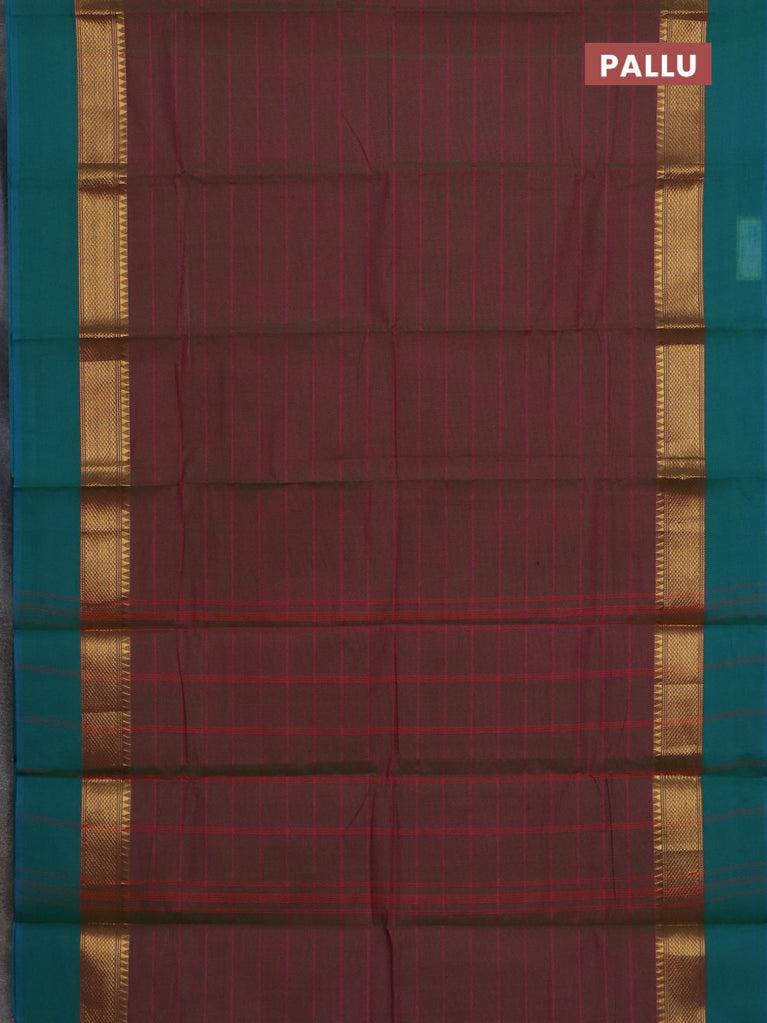Chettinad cotton saree dual shade of maroon and teal green with allover stripe pattern and ganga jamuna border