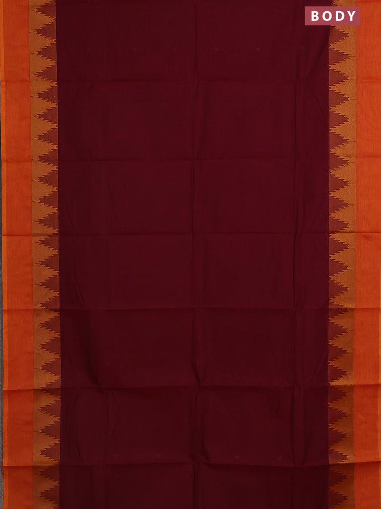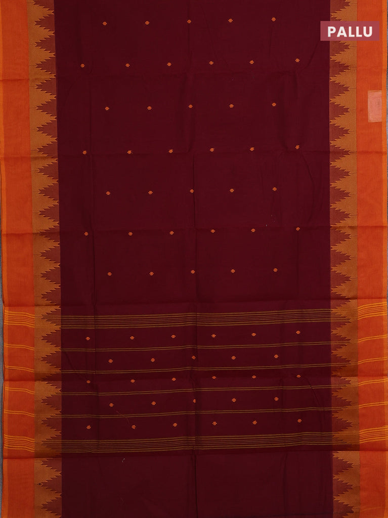 Chettinad cotton saree maroon and sunset orange with thread woven buttas and temple design simple border